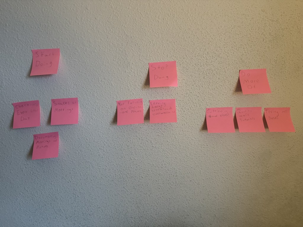 Another thing I learned was to review my processes and products. For example, we were asked to review our process of being a PM late in the quarter, which involves making sticky note cards oriented around three topics: Start Doing, Stop Doing, and Do More Of. I took time to reflect on what had happened this quarter, and was pleased with my insights I had for myself- for example, in Start Doing, I wanted to make sure that I knew to document things like meetings or project work times with photos. These can be used both for reference later, and as content for promotion!
