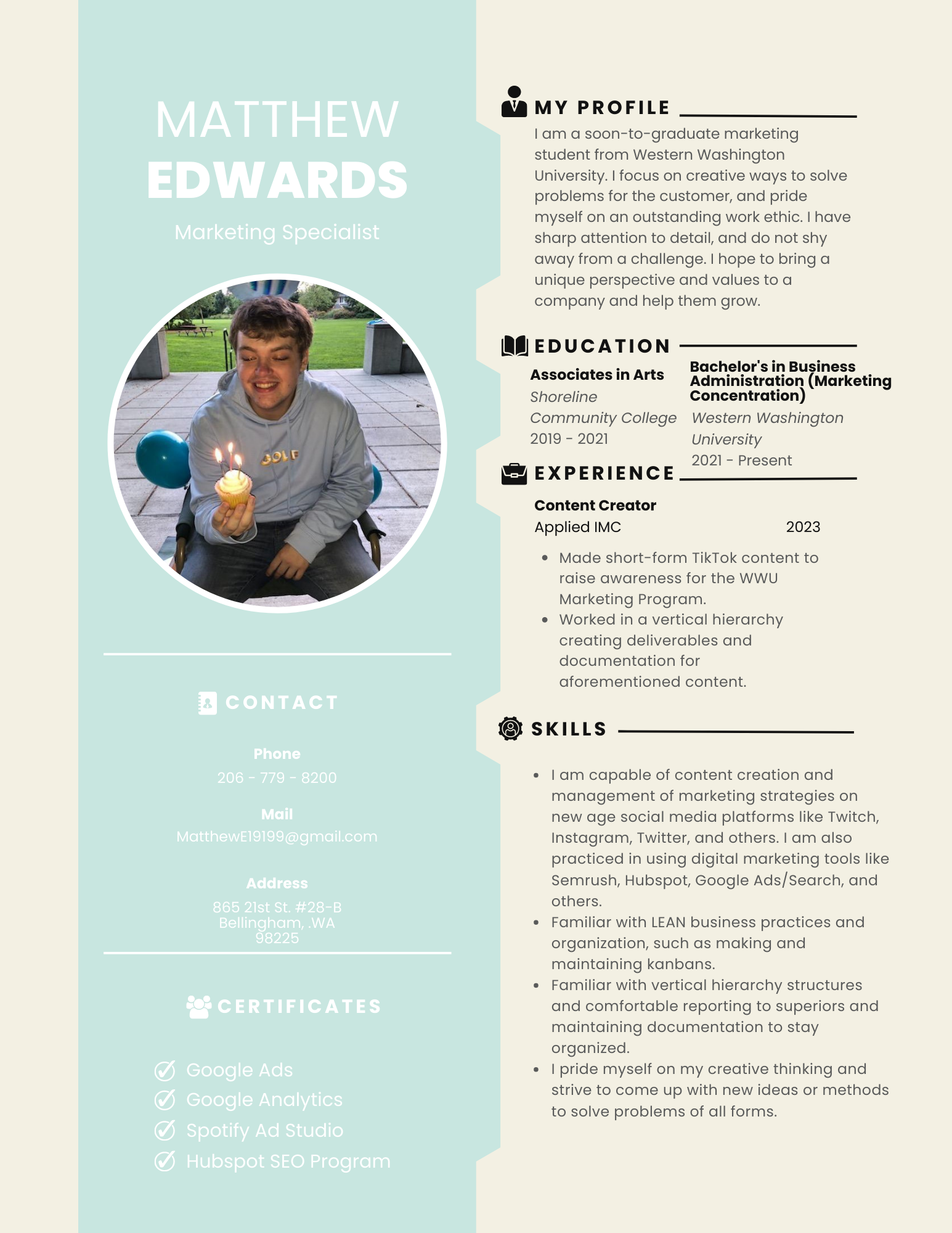 Current Resume, with up-to-date information on my experience, qualifications, and characteristics that I believe make me a great addition to any team! My Resume Example Cover Letter Twitter LinkedIn YouTube